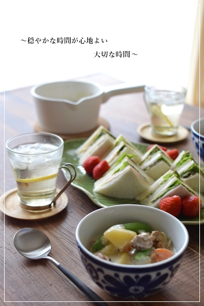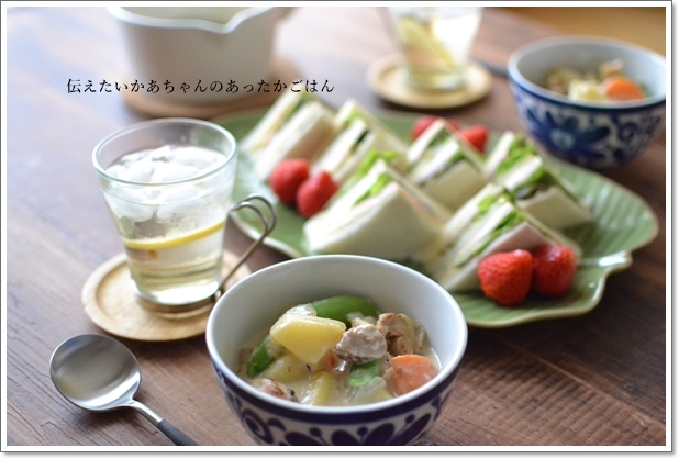 肌寒かったのもあり、温かいクリーム煮とサンドイッチで朝ごはんです。