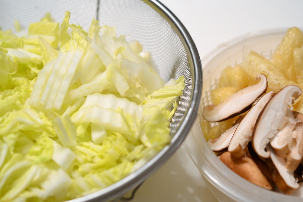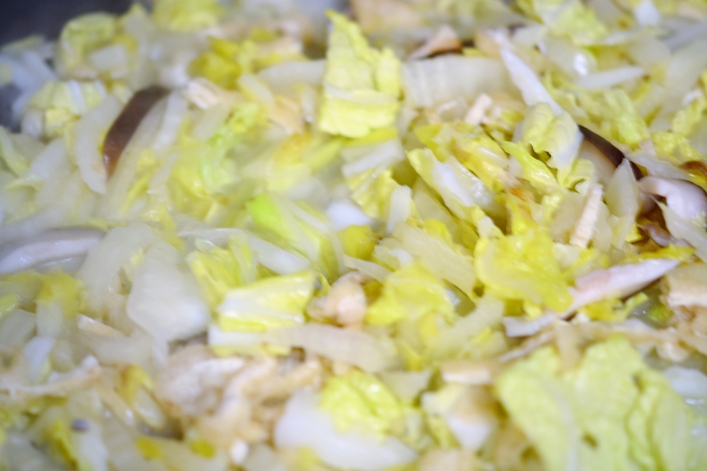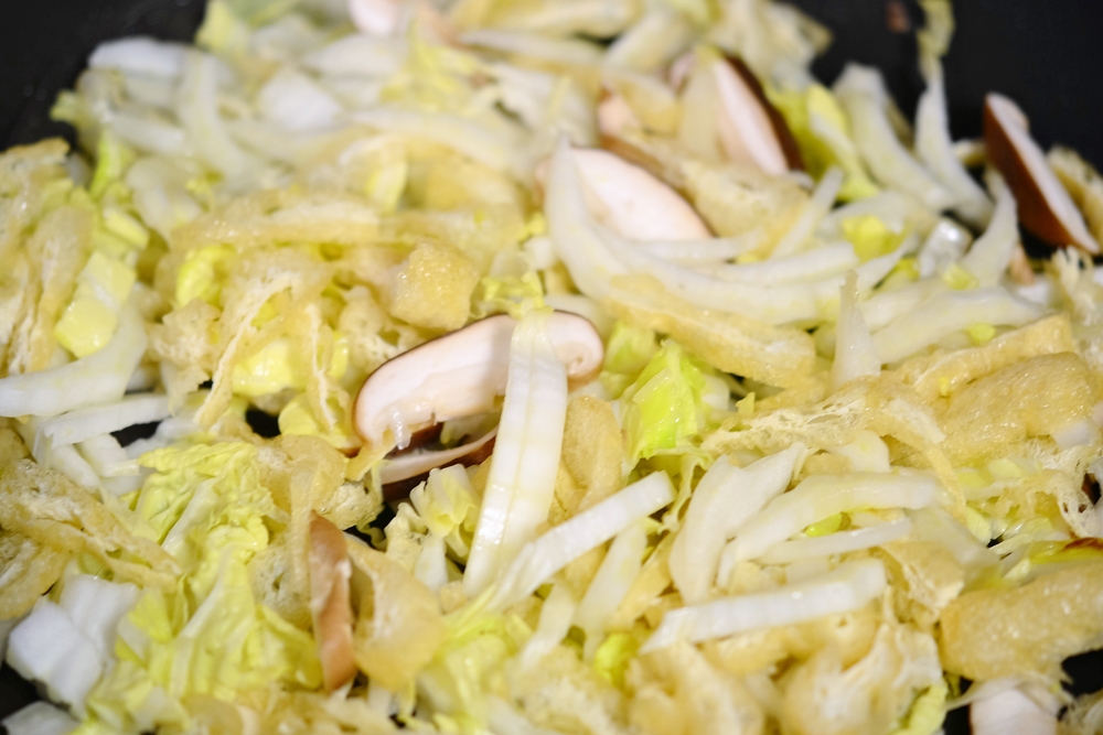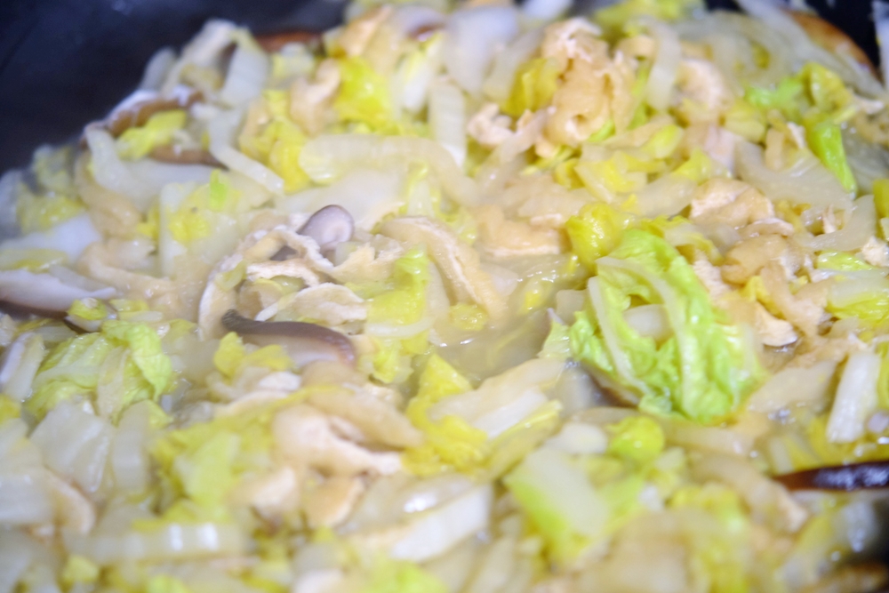 椎茸、油揚げを入れ、白菜の芯がしんなりするまで炒める。