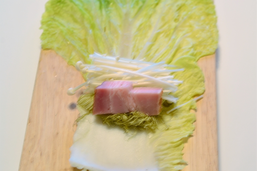 ⑤白菜を広げ、とろろ昆布、白菜の芯、えのき、ベーコンの順にのせ下からきつめに巻く。