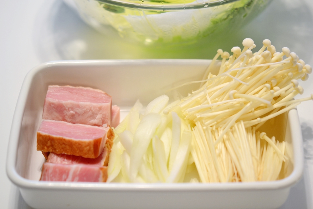 ④ベーコン、白菜の芯、えのきは巻きやすいように白菜の幅に合わせて切る。