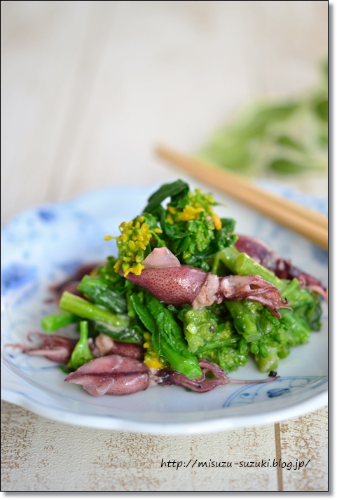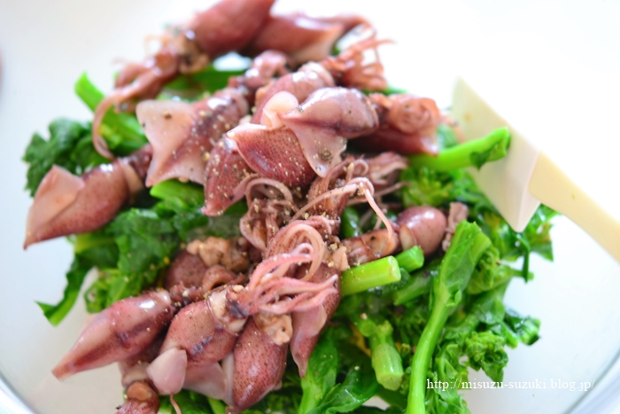 ③★を混ぜ合わせたとこへ、菜の花、ゆでほたるいか、