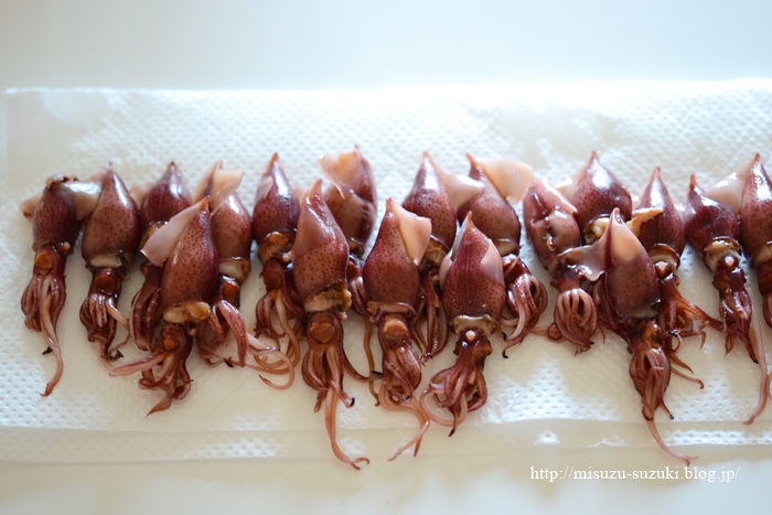 ②ゆでほたるいかは、目、くちばし、軟骨を取り除きやさしく水で洗い、