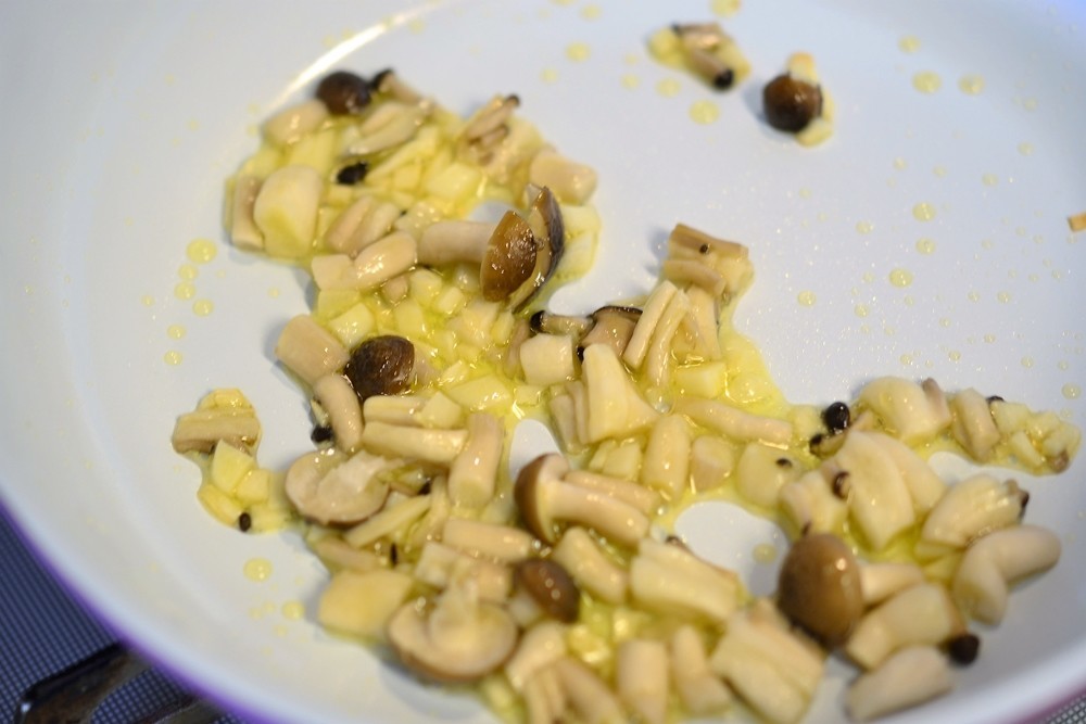 しめじ、白ワインを入れしめじがしんなりするまで炒める。