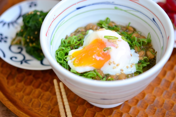 【納豆とがごめ昆布とろろの温玉丼】