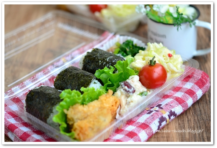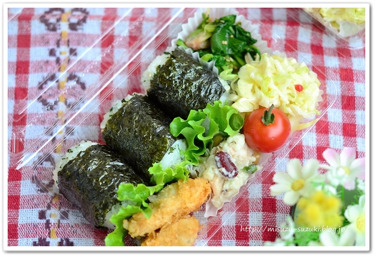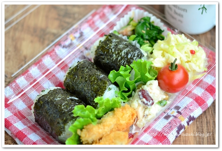 作りおきおかずと、晩ごはんからの取り置きを詰めて、俵むずびを握っただけ。