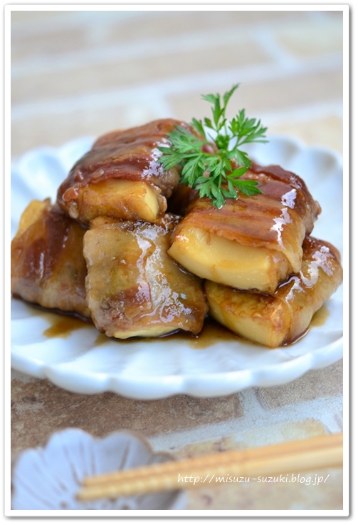 ①厚揚げ豆腐は1cm幅に切り、がごめ昆布おぼろを巻き、豚バラ肉を巻く。