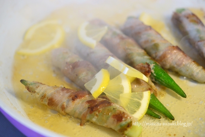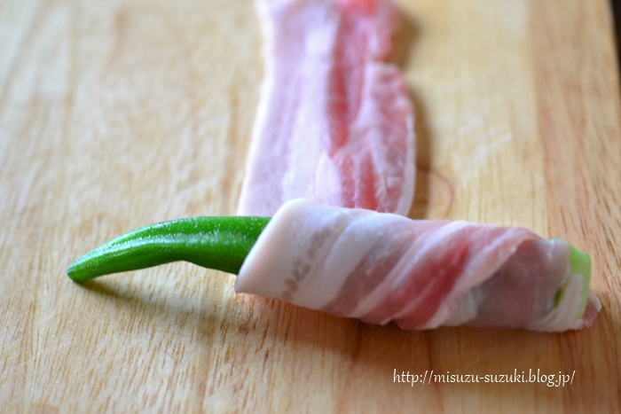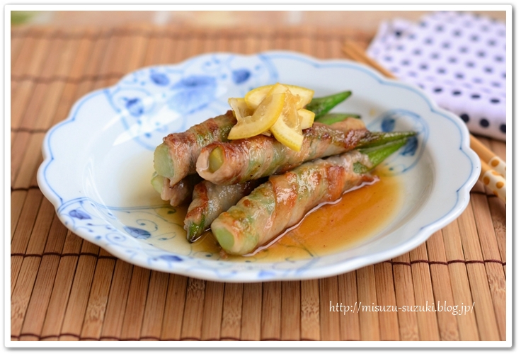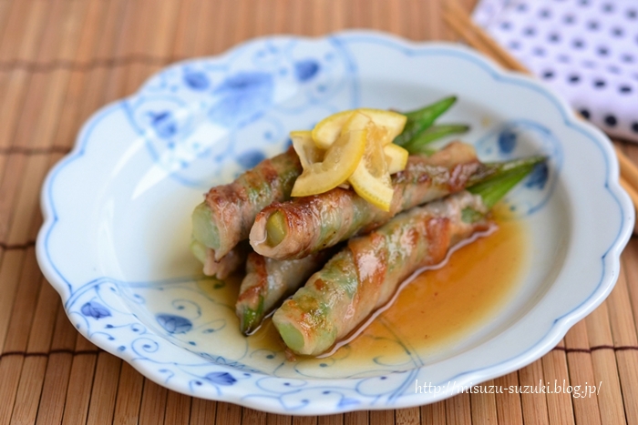 ビタミンB1が豊富に含まれた豚バラ肉で巻いて焼き、さっぱりとした