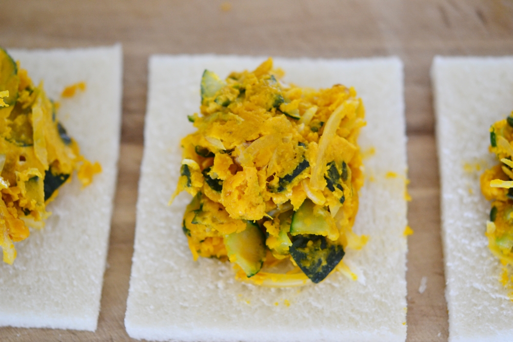 ①サンドウィッチ用のパンに、かぼちゃのデリ風サラダをのせる。