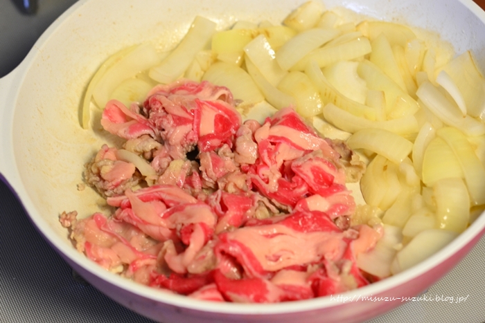 、牛薄切り肉、料理酒を加え色が変わるまで炒める。