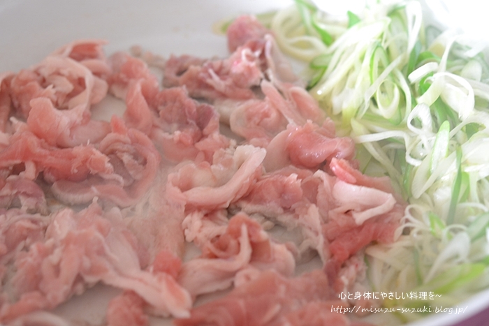フライパンの隅に寄せ、豚こま切れ肉を加える。