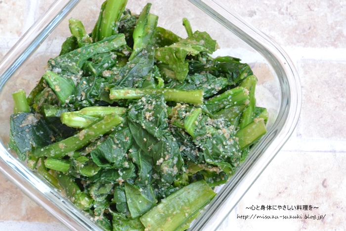 作り方は、小松菜をレンジ加熱して冷水にさらし水気を絞り、調味するだけ。