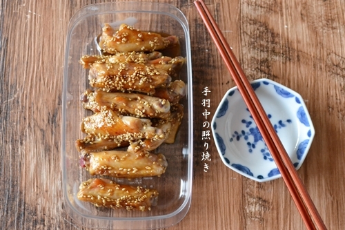 手羽中をフライパンでこんがり焼き、照り焼きのタレを加え、