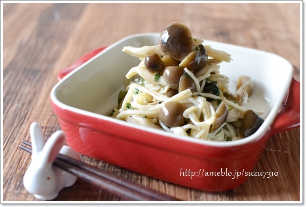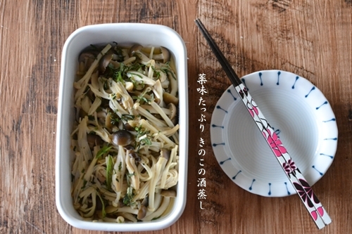 3種類のきのこと、だし昆布で酒蒸してうま味たっぷり。