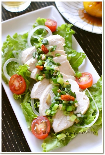 しっとりやわらか~い蒸し鶏にピリ辛のネギソースが