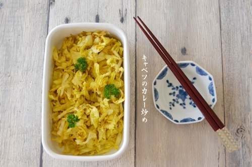 果物を切って盛り付け、キャベツのカレー炒めが温まったら、