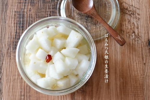カリカリに焼き、作りおきのはちみつ大根の生姜漬けを豆皿に盛り付けて。