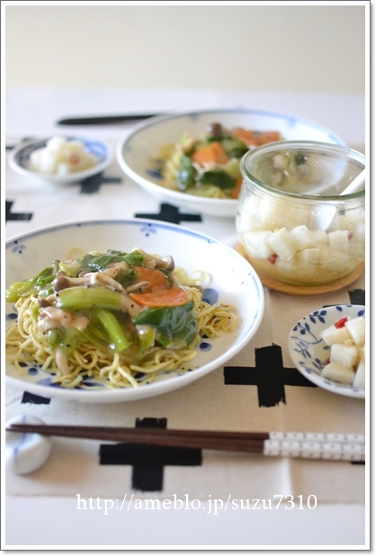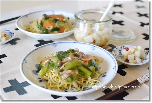 盛付け、中華麺を器におき、青梗菜のあんかけをかけてできあがり。