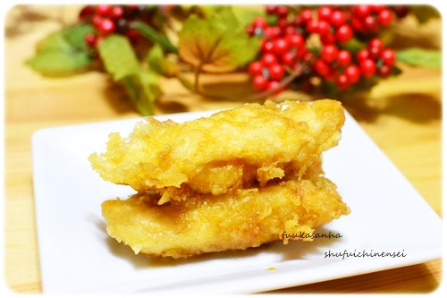 届いています、好評の天ぷら粉でサクサクに揚げて 甘辛いタレを絡めます。