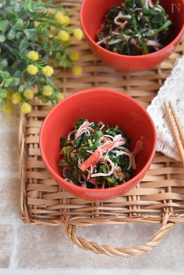 副菜は、作り置きの春菊とカニかまのうま塩サラダとたくあん。
