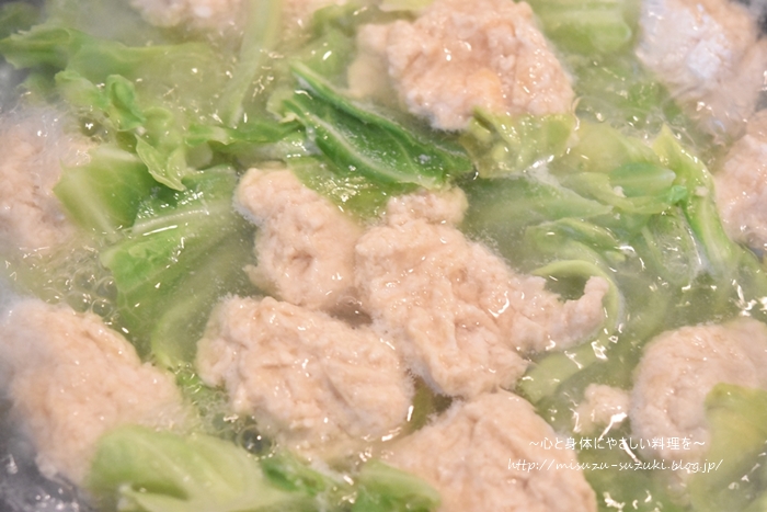 キャベツをサッと煮たら、鶏だんごと調味料を加え5分煮るだけ。