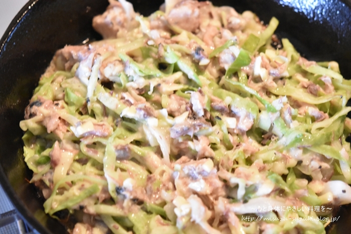 今日のレシピは、オイルキャベツとさばの水煮缶のチーズ焼きです♪
