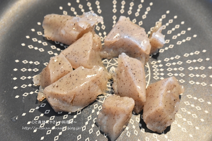 ③フライパンを強火で熱し、板こんにゃくを入れ乾いた音になるまで乾炒りをする。