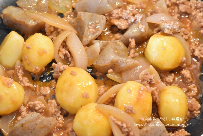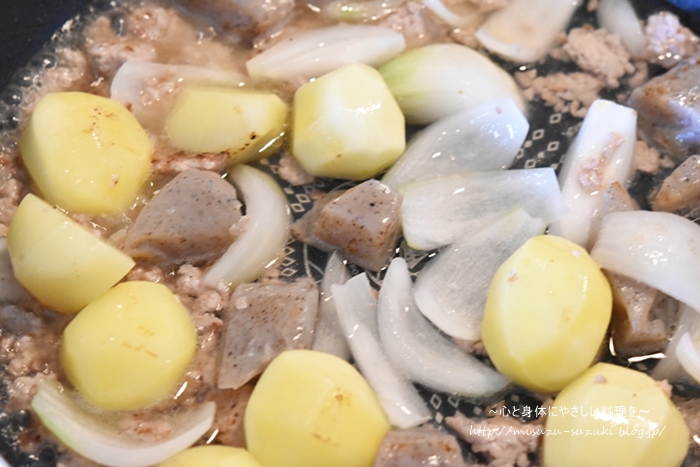じゃがいも、こんにゃく、玉ねぎを加えてボリュームアップ。