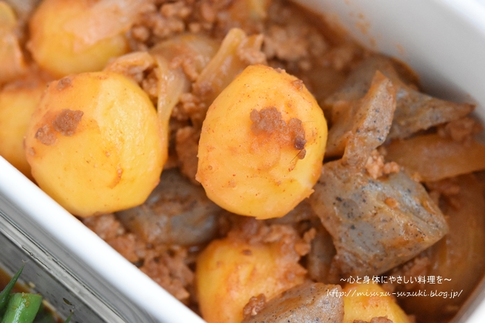 【じゃがいもとこんにゃくのピリ辛肉味噌】