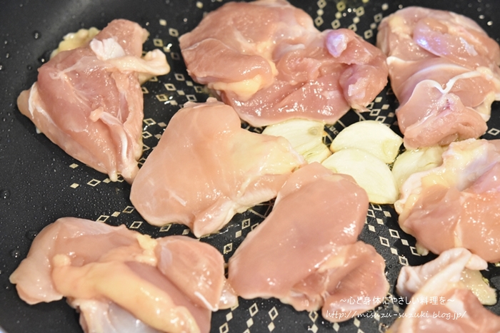 ①鶏もも肉は一口大、にんにくは薄切りにする。