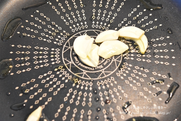 ②フライパンにオリーブオイル、にんにくを入れ中火で熱し、