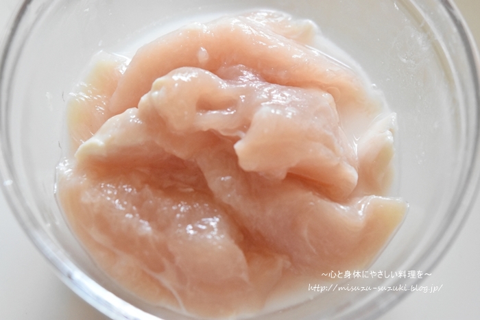 ささみは筋を取り、お酒と片栗粉を揉み込んでから焼くので、
