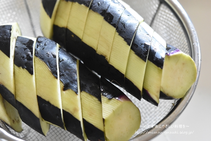 ②なすはヘタを取り、1.5cm間隔にピーラーで縦に皮をむき、1cm幅の斜め切りにする。