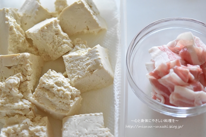 キッチンペーパーの上に置いて水気をきる。豚バラ薄切り肉は2cm幅に切る。