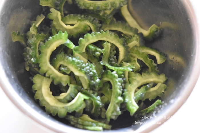 ②ゴーヤは縦半分に切り、薄切りにして塩をふりしんなりしたら軽く水気を絞る。