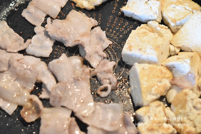 木綿豆腐を入れ表面に焼き色がつくまでじっくり焼く。
