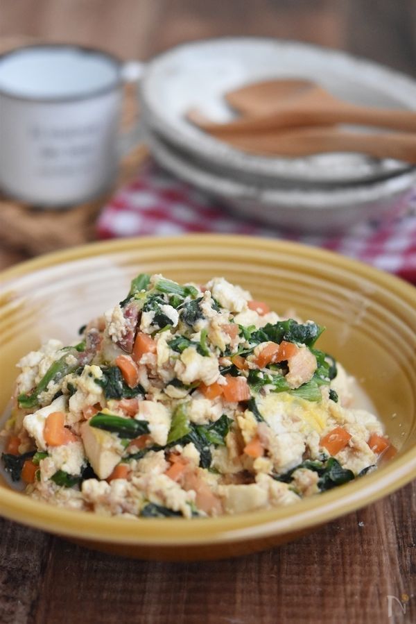 レシピ→女性に嬉しい大豆イソフラボンが豊富でヘルシーな炒りたま豆腐