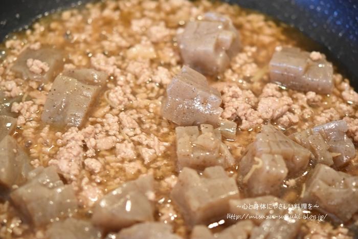 今日のレシピは、こんにゃくの甘辛そぼろあんです♪♪