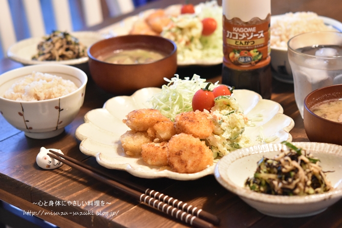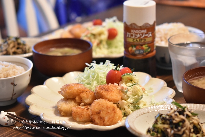 千切りキャベツと作り置きのポテトサラダを添えて♪