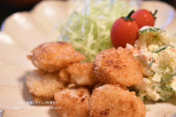 天粉→パン粉をつけ180度の油で揚げたチキンカツ。
