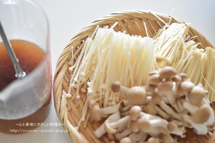 ①しめじは石づきを取り小房に分け、えのきは石づきを取り半分に切る。★を混ぜ合わせる。