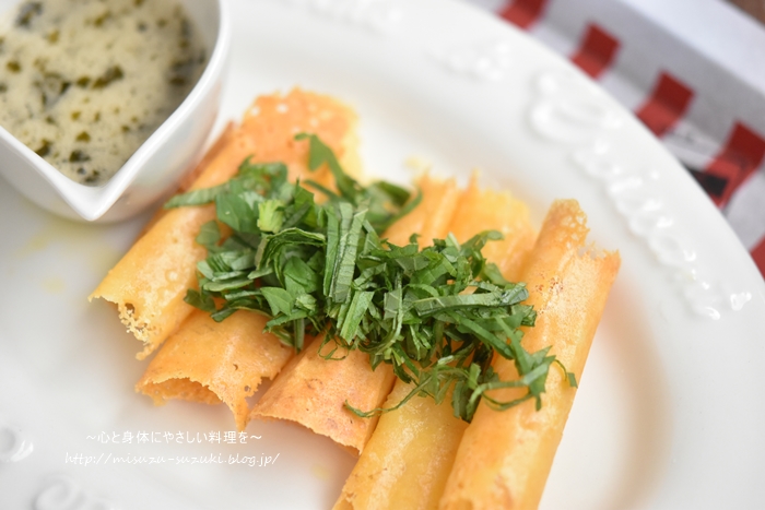 円形に広げたものを6枚作り、きつね色になったらヘラで巻いていく。