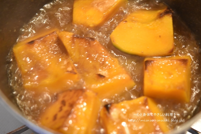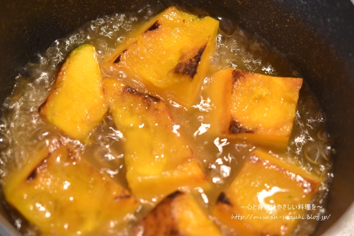 ・かぼちゃはやわらかくなってから調味料を加えると、味が早く染み込みやすくなります。
