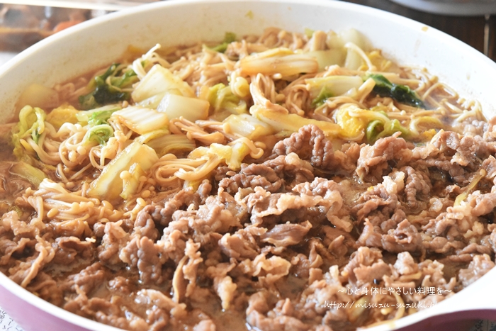 蒸し煮にして白菜の甘みを引き出し、合わせダレ(砂糖、醤油、酒、みりん)を加え、