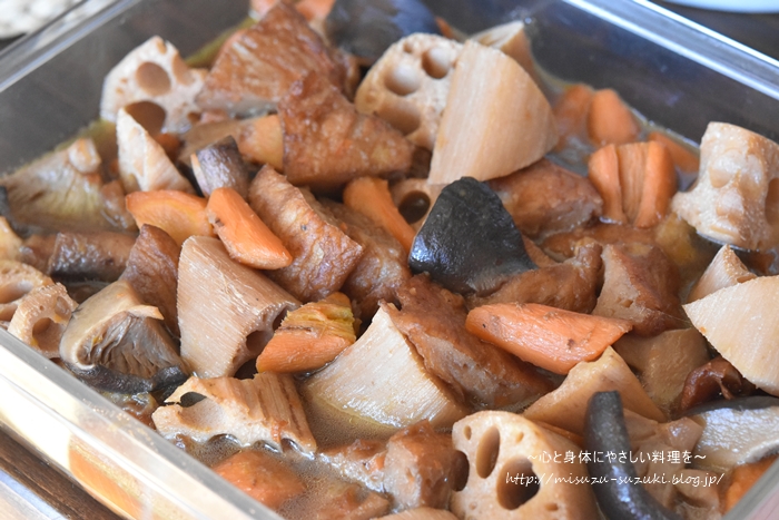 砂糖、醤油、みりん、酒で味付けして20分ほど煮ました。