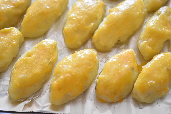牛乳を加え潰しながら練り形を整え、つや出しの卵黄をハケで塗り、