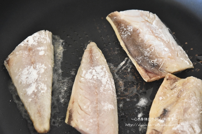 塩鯖を切って薄力粉をまぶし、フライパンでカリッと焼いたら、