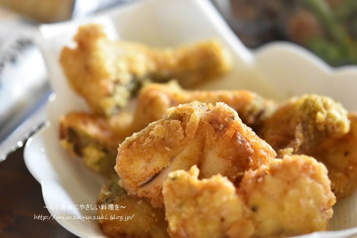 マヨネーズ、カレー粉、塩こしょうで下味をつけ、片栗粉をまぶして油で揚げました。