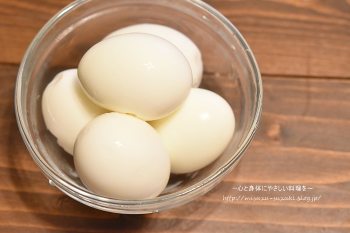 沸騰して6分ゆで冷水に浸し殻をむく。