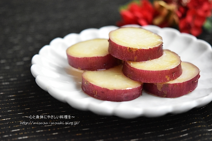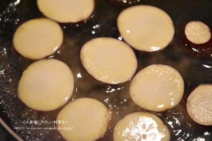 ①さつま芋1㎝幅の輪切りにして、水に10分浸してアクを抜き、