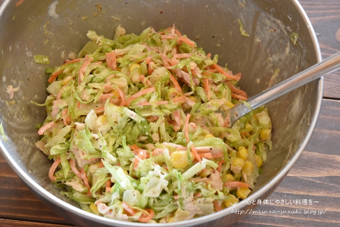 全体がしまりとても食べやすいコールスローサラダになりましたよ~。